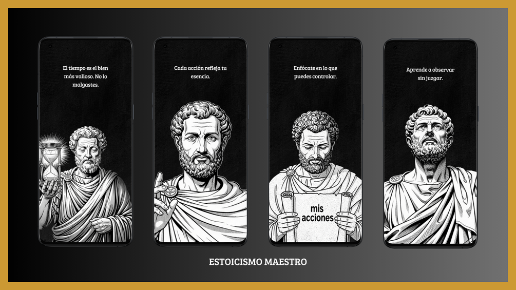 Recibirás 50 fondos exclusivos inspirados en enseñanzas de Marco Aurelio, Séneca y Epicteto. Cada imagen está diseñada para ayudarte a: