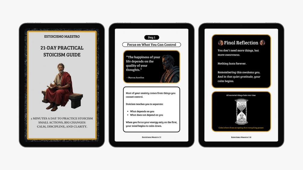 It includes 21 Stoic quotes, each with exercises and reflections, designed to be applied in just 5 minutes a day. Enhance your focus, discipline, and inner calm. At the end, you’ll find a special bonus: 21 Stoic Rules for Life.