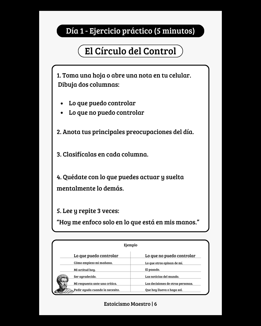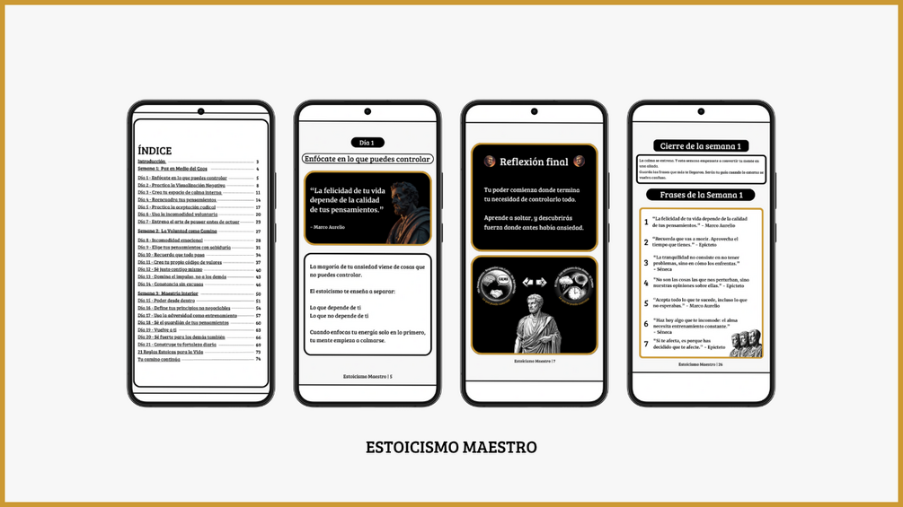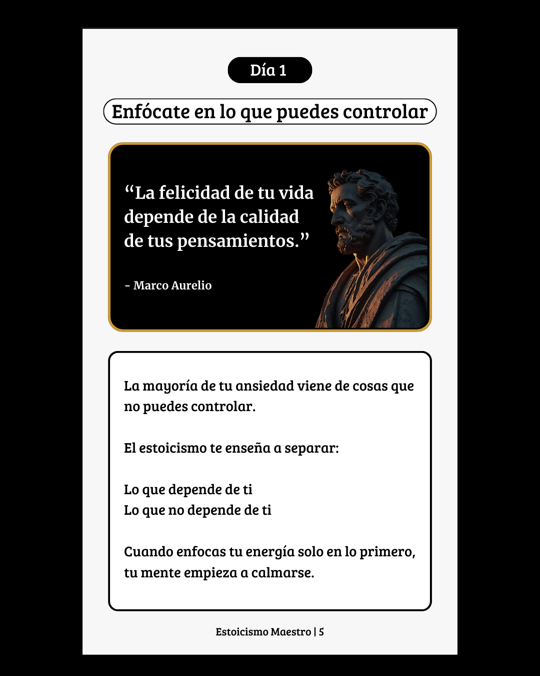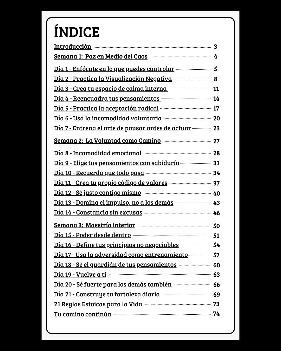 Incluye 21 frases estoicas con sus ejercicios y reflexiones, diseñadas para aplicarse en solo 5 minutos al día. Mejora tu enfoque, disciplina y calma interior. Al final, encontrarás un bonus especial: 21 Reglas Estoicas para la vida.
